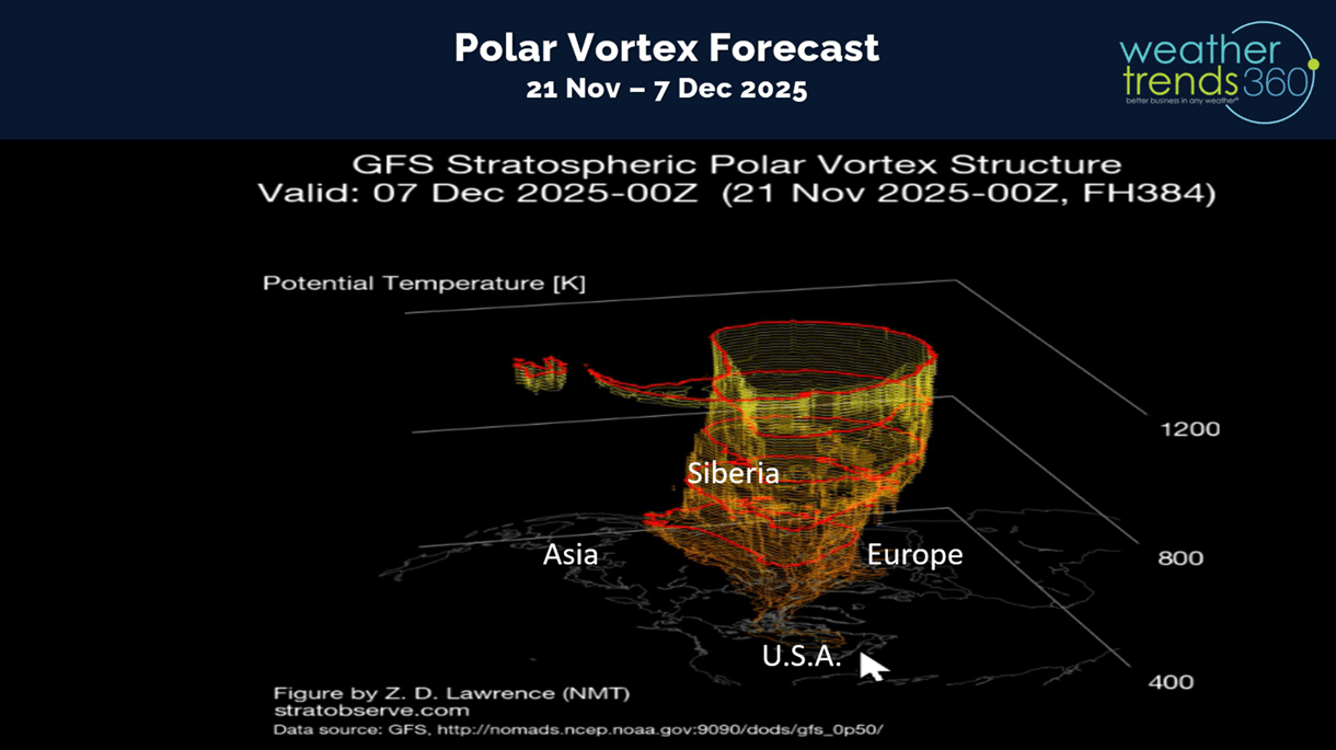 Polar Vortex is weak which allows intrusions of Arctic Air to push South. A brief, weak glancing shot for Thanksgiving weekend and then another one in early December. It's important to note that just because the Polar Vortex is weak, doesn't mean the cold air will impact the U.S., in can just as easily shift into Europe or Asia.