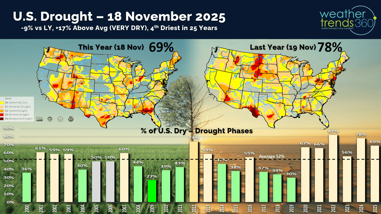 As of 18 November, 69% of the U.S. is in dry to drought phases vs 78% this time last year. Average is around 52% of the U.S. in dry phases. Again, this will make a dramatic improvement over the months ahead. The peak year was 2022 with 82% of the U.S. dry and the least drought was in 2009 at 27%.