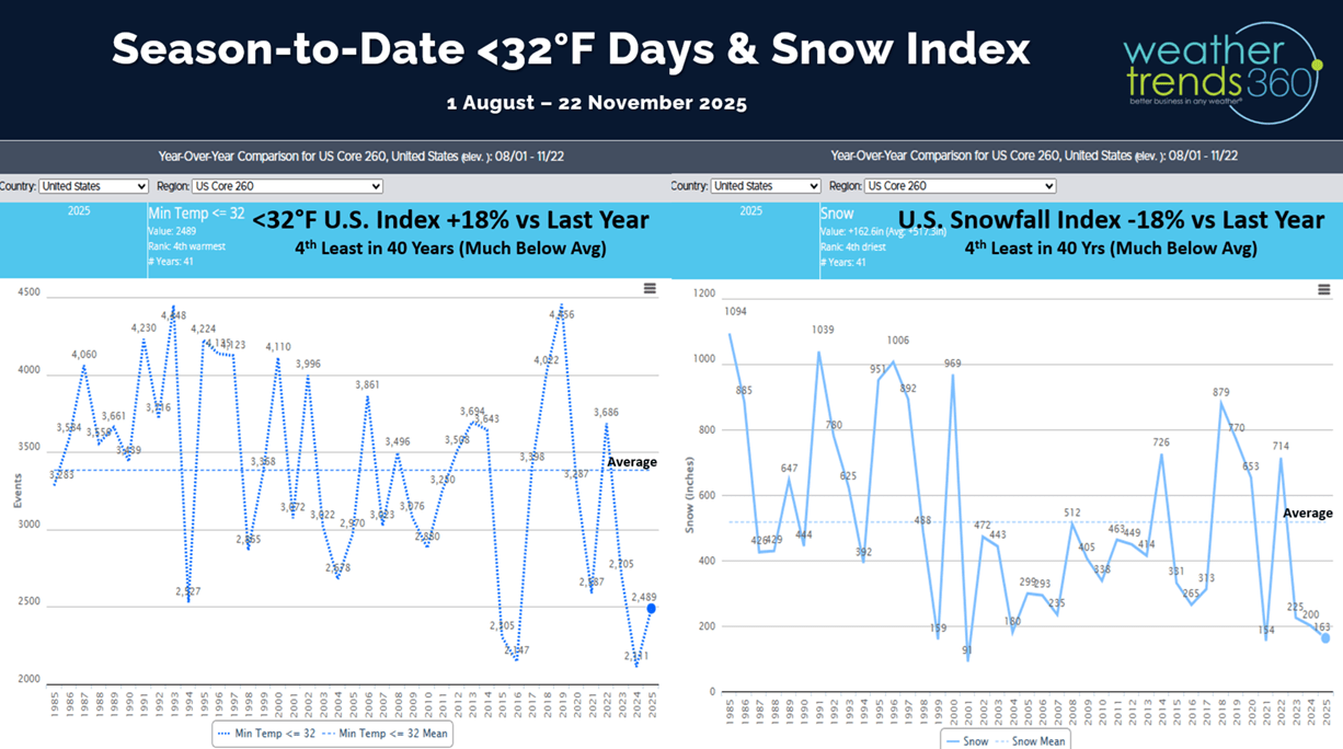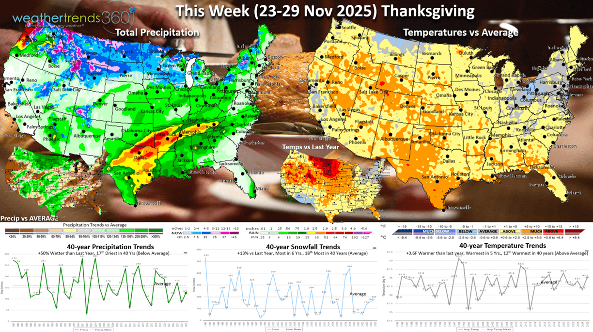 This Thanksgiving week (23-29 Nov) is a little misleading with a mild start but then a much colder Thanksgiving weekend. For the week overall, the U.S. trends +3.6F warmer than a year ago, warmest in 5 years and 12