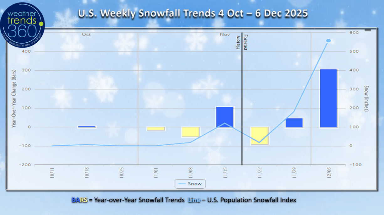 The 2-week U.S. snowfall outlook shows a snowier pattern ahead, with a particularly snowy first week of December. The bars show the YOY change in national snowfall, while the line shows the total snow index across 260 cities.