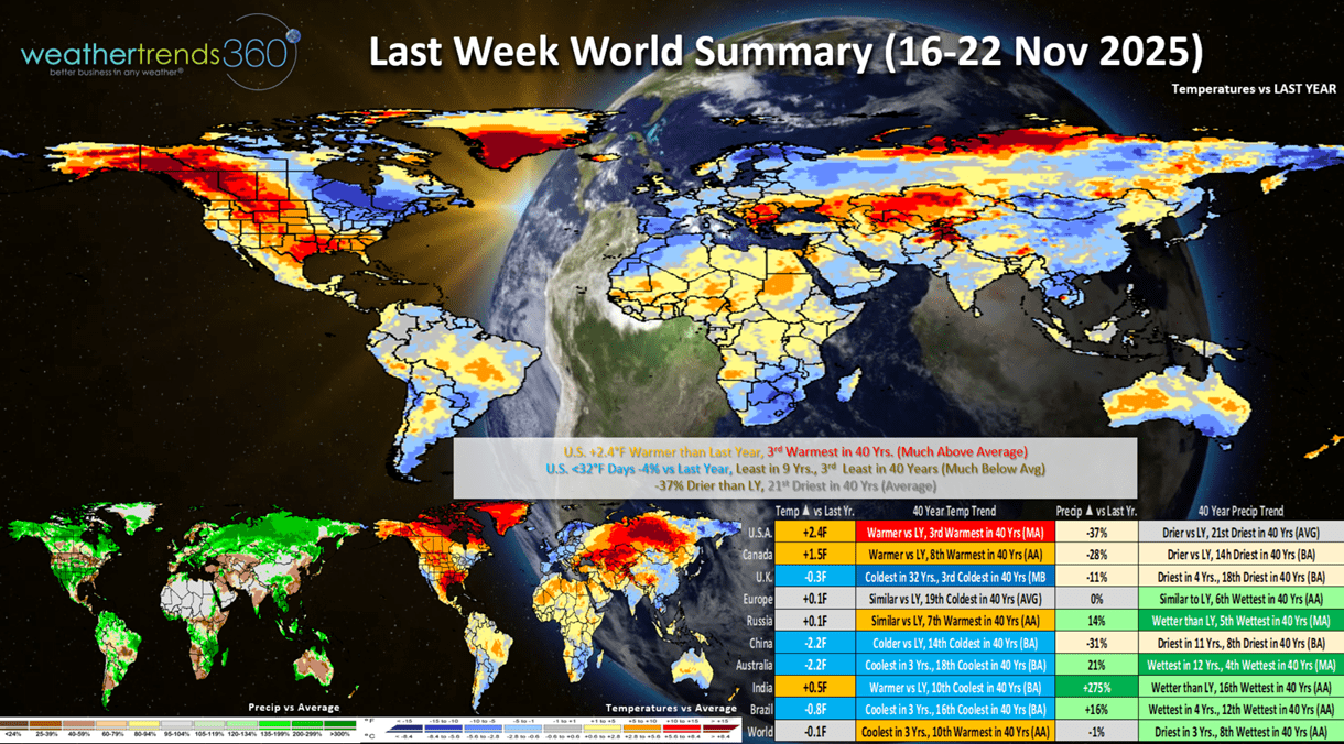 Last week (16-22 Nov) across the World shows the U.S. trending +2.4F warmer than last year and 3