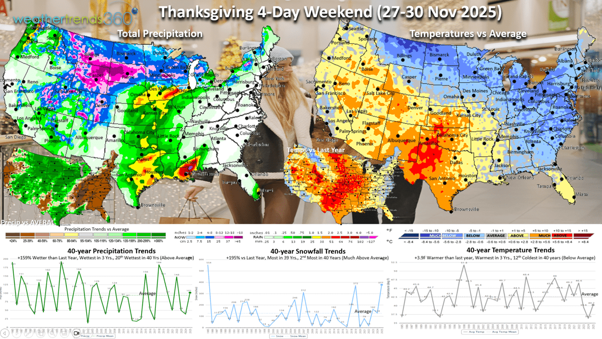 Thanksgiving 4-day weekend (27th - 30th) shows a much colder trend in the East as a cold front sweeps of the East Coast. The U.S. overall trends +3.9F warmer than last year's coldest Thanksgiving in 40 years, but still 12