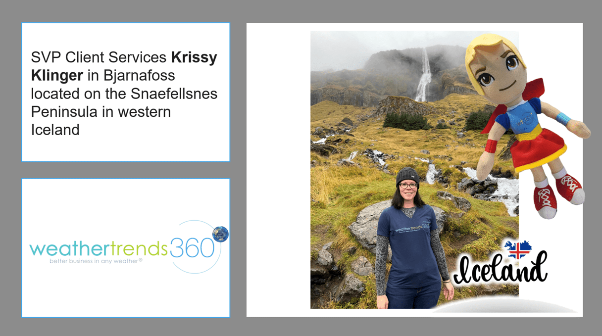 wt360 SVP Client Services (meteorologist) Krissy Klinger is touring Iceland where it's the warmest in 9 years, but also the wettest in 10 years this week. She's pictured here in Bjarnafoss located on the Snaefellsnes Peninsula in western Iceland; since she has her wt360 shirt on we'll consider this marketing. :)