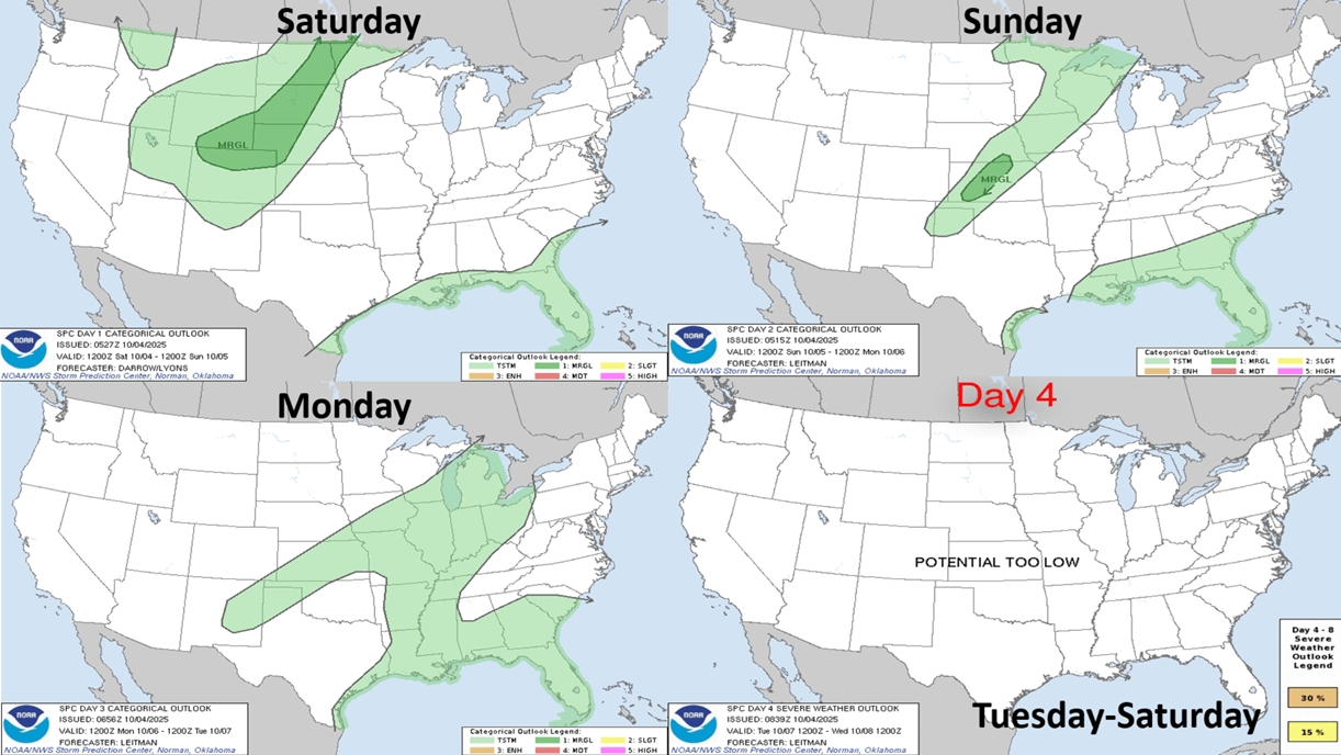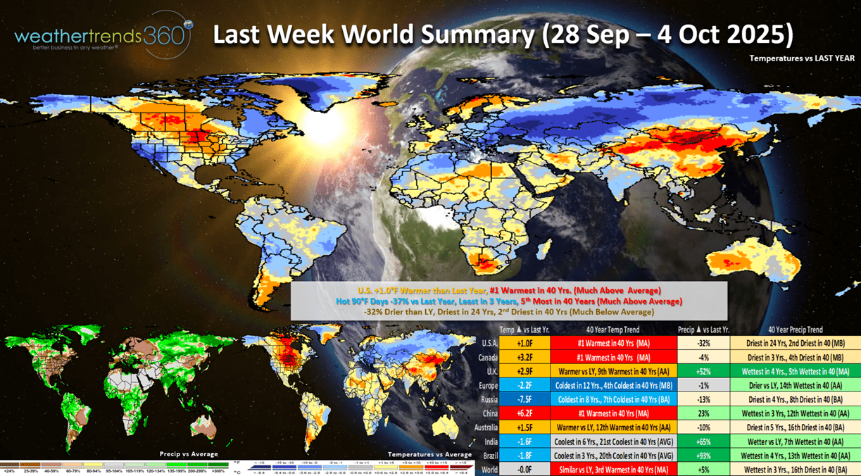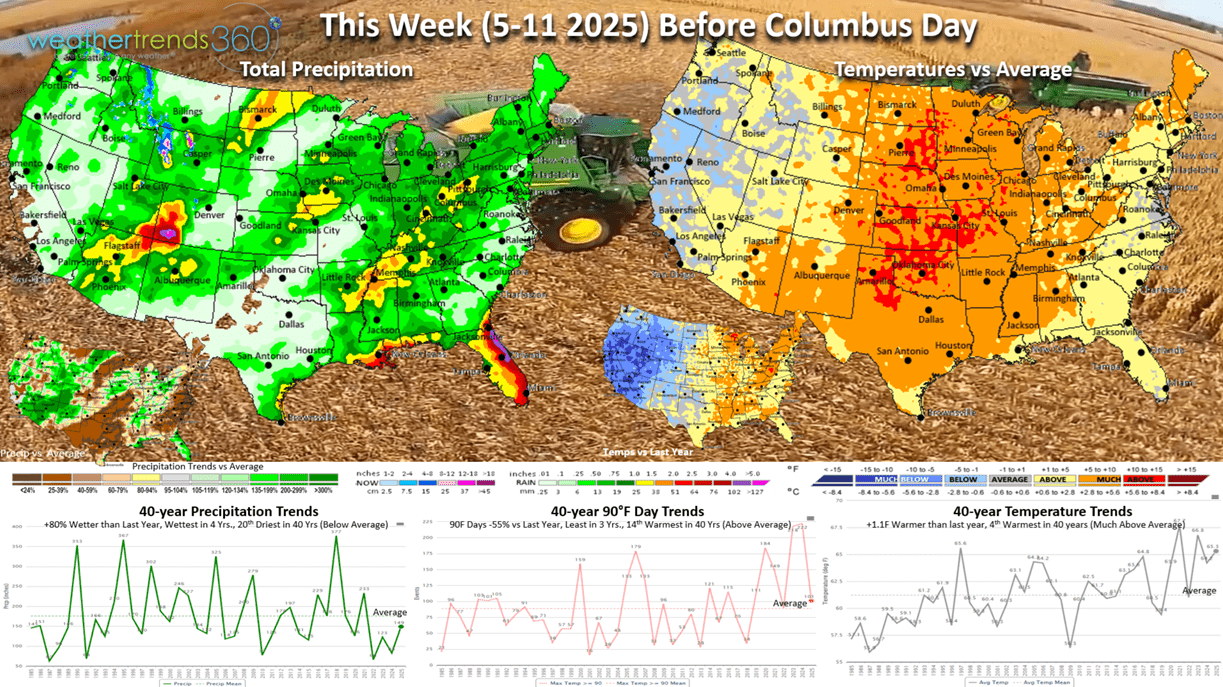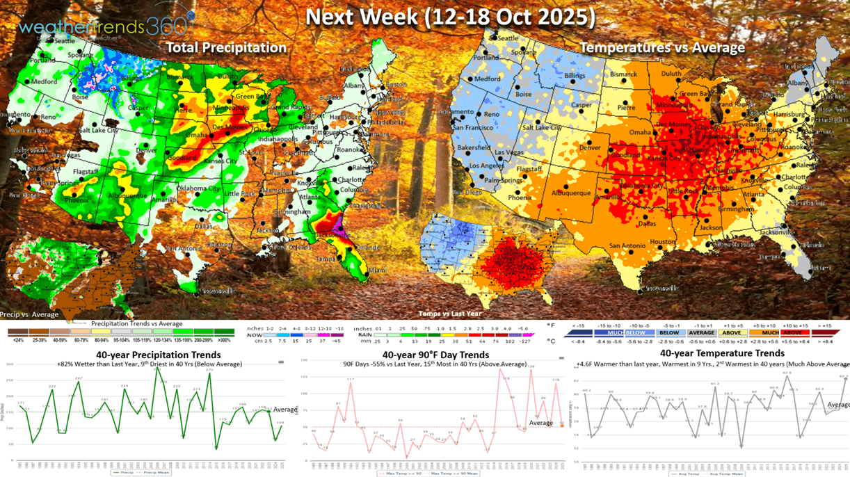 This week (5-11 Oct) prior Columbus Day shows continued warm weather with the U.S. trending +1.1F warmer than last year, 4th warmest in 40 years, but hot 90F days are way down -55% vs LY, least in 3 years and 14th most of the past 40 years. Rainfall up +80%, wettest in 4 years and 20th driest of the past 40 years. Need to watch for tropical systems that could develop quickly across the Southeast U.S. The most favorable areas for early Fall merchandise would be the West Coast. The first significant snows are possible in the higher terrain of the Northern Rockies (MT, WY). With the dry weather, the Fall harvest is off to a very fast start with a huge corn crop in the U.S.