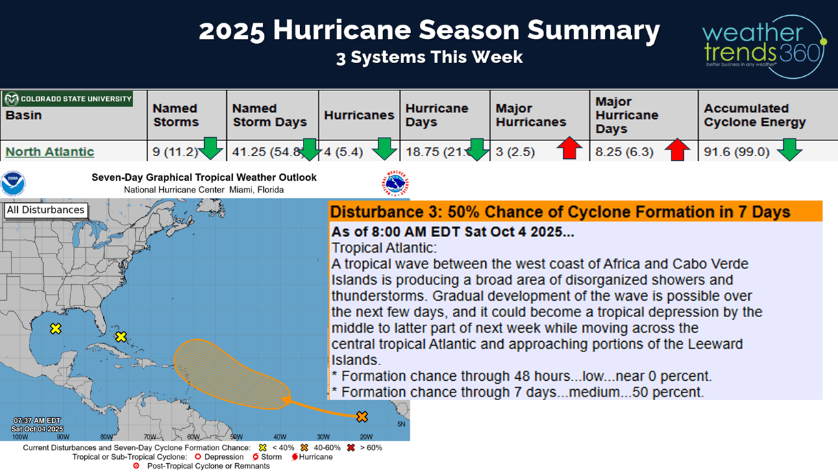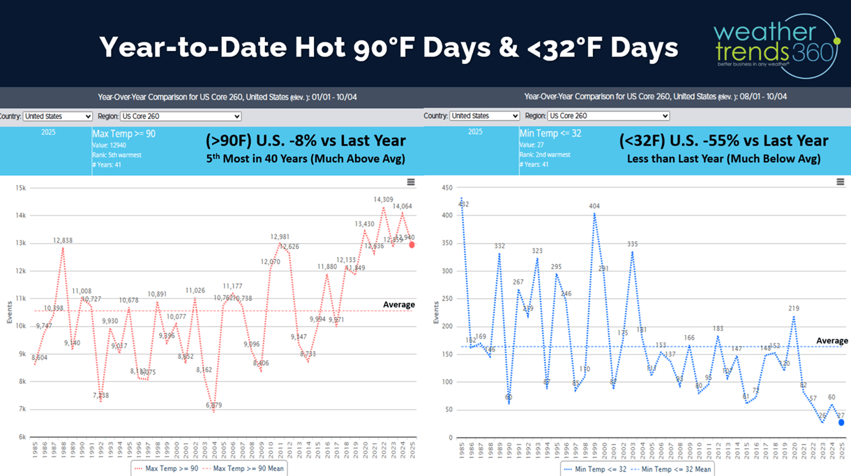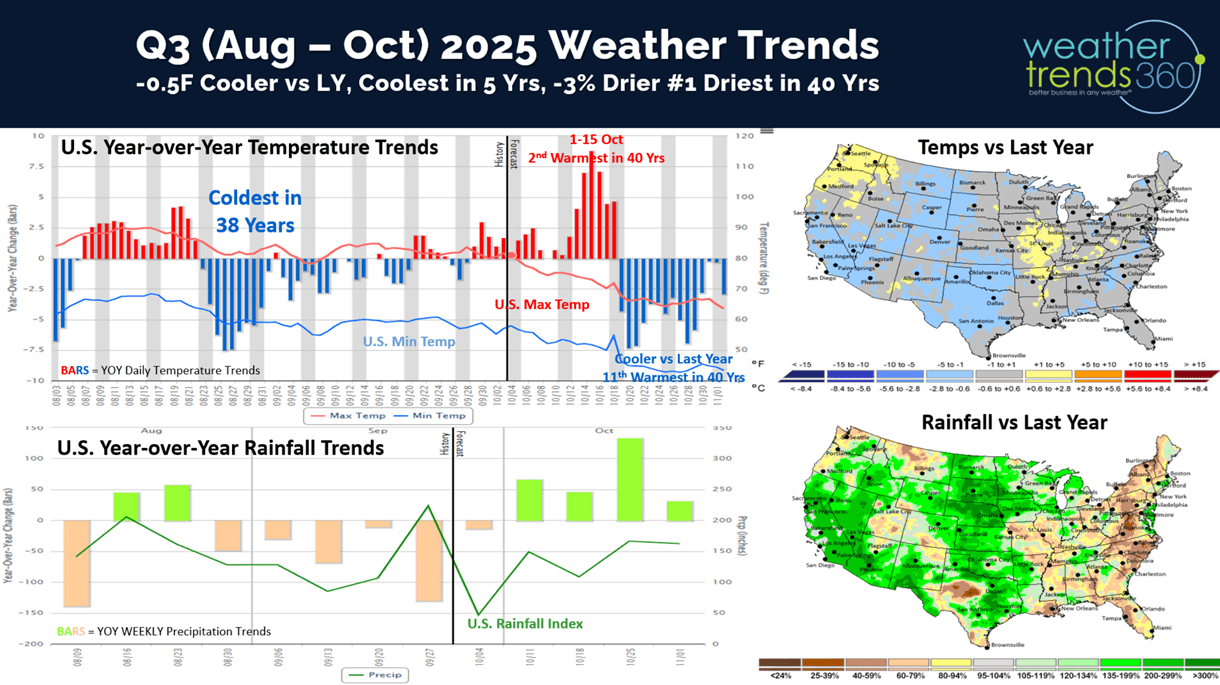 Q3 (Aug - Oct) showed the most favorable period for colder weather was around Labor Day when the U.S. was the coldest in 38 years, but now the front half of October trending the 2nd warmest in 40 years. But, there are signs of a cooler/wetter pattern for the latter half of October which should bring a boost in early Fall seasonal categories. The quarter overall looks to trend the coolest in 5 years (still above average) and -3% drier than last year, making it the #1 driest in 40 years. Still need to watch for a landfalling hurricane along the East Coast over the next month.