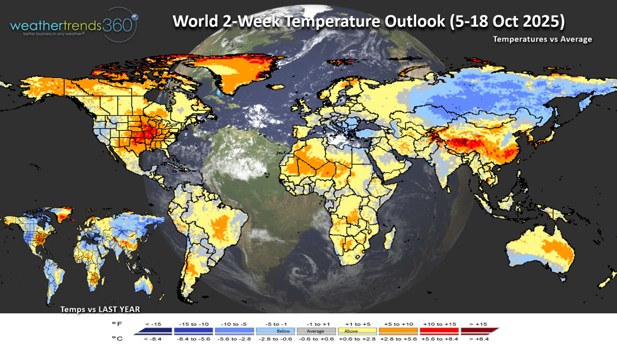 The World 2-week (5-18 Oct) temperature outlook shows the warm conditions in the U.S. with more seasonable weather in Europe. It remains very cold across Siberia.