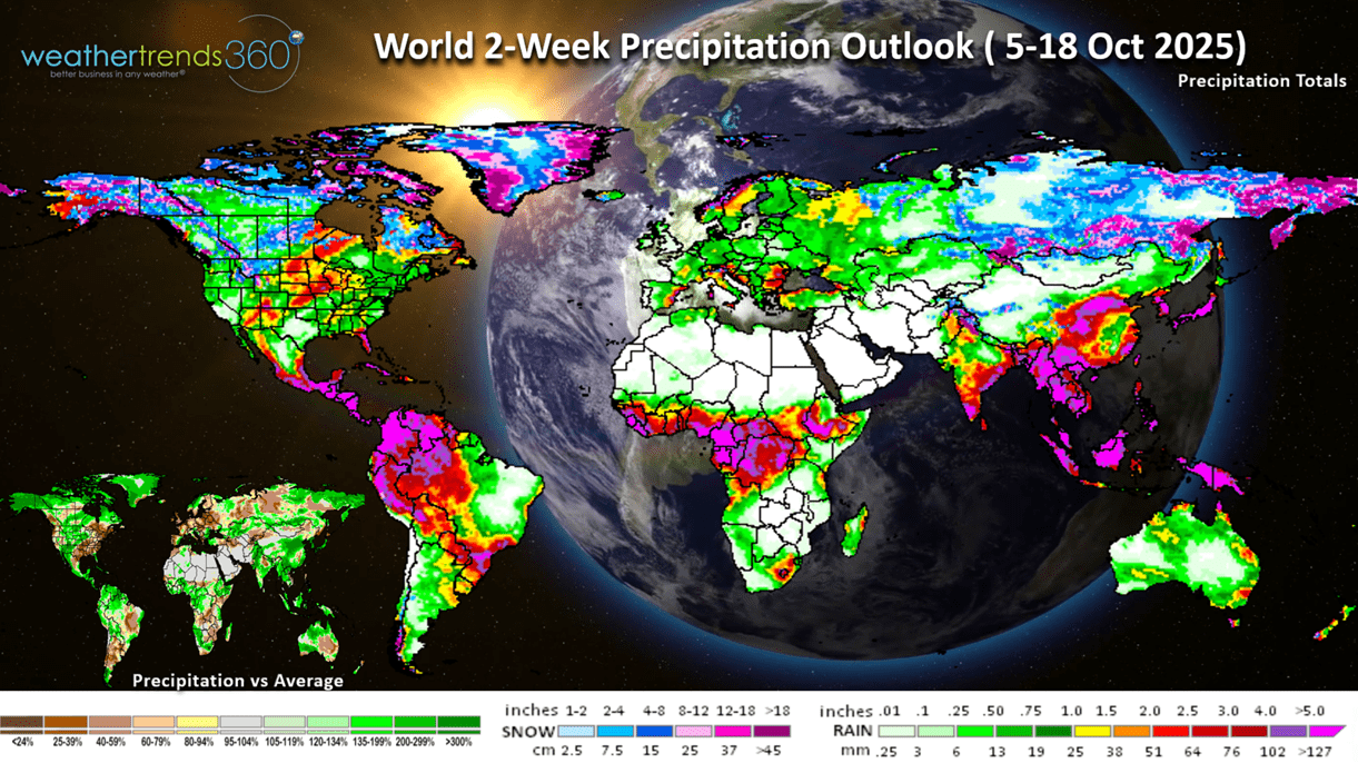 The World 2-week (5-18 Oct) precipitation outlook shows a wetter pattern in the Central U.S. but continued dry in the East. Heavy snow across Alaska! Dry across Europe and the U.K.