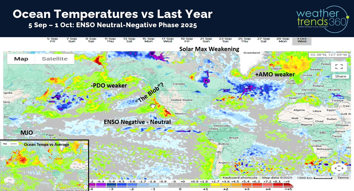 major climate indices taking shape that are pointing to a big pattern shift this Fall-Winter and well into 2026. While there is buzz about a weak La Niña (cooling of the equatorial Pacific Ocean) again, it's is more likely just a weak negative phase that won't last very long before a warming trend takes shape suggesting an El Niño in 2026 is becoming more likely.