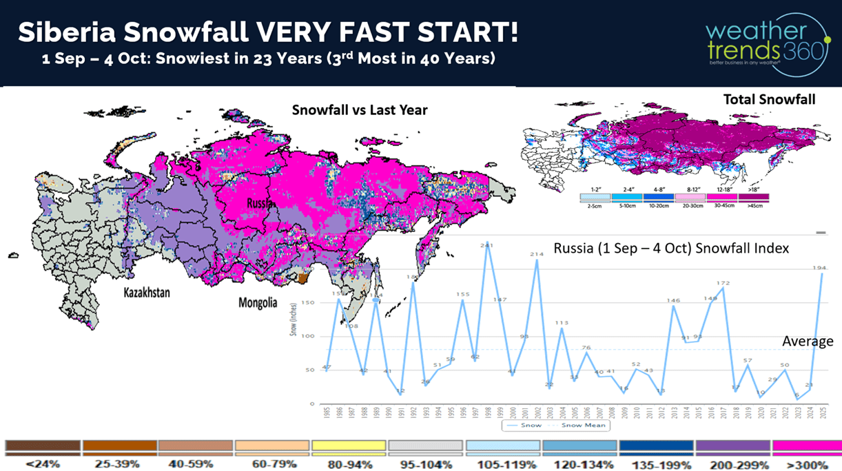 snowfall in Siberia begins to take shape and that's off to the fastest start 23 years! There is some research to suggest heavy early snowpack in Russia leads to a weaker Polar Vortex in turn allowing Arctic Air to move more freely across North America and Europe - aka ANOTHER COLD WINTER AHEAD! A weaker neutral ENSO phase also suggests for bigger snowstorms the latter half of Winter into Spring as well in the U.S.