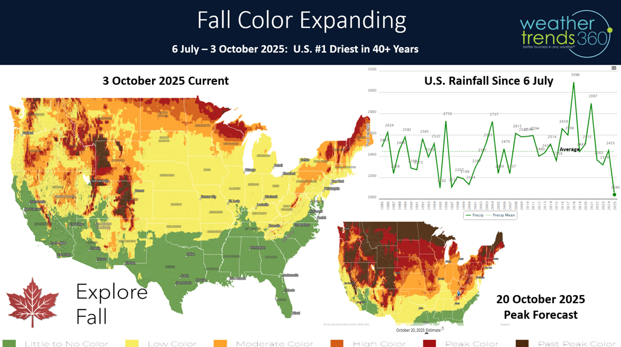 Since July 4th weekend, the U.S. is now trending the #1 driest in 40 years. The exceptionally dry pattern will have Fall leaves peaking early and falling very quickly with stressed trees. Drought years can bring nice Fall color, but trees also go in stages and fall quickly, so enjoy it while it lasts.