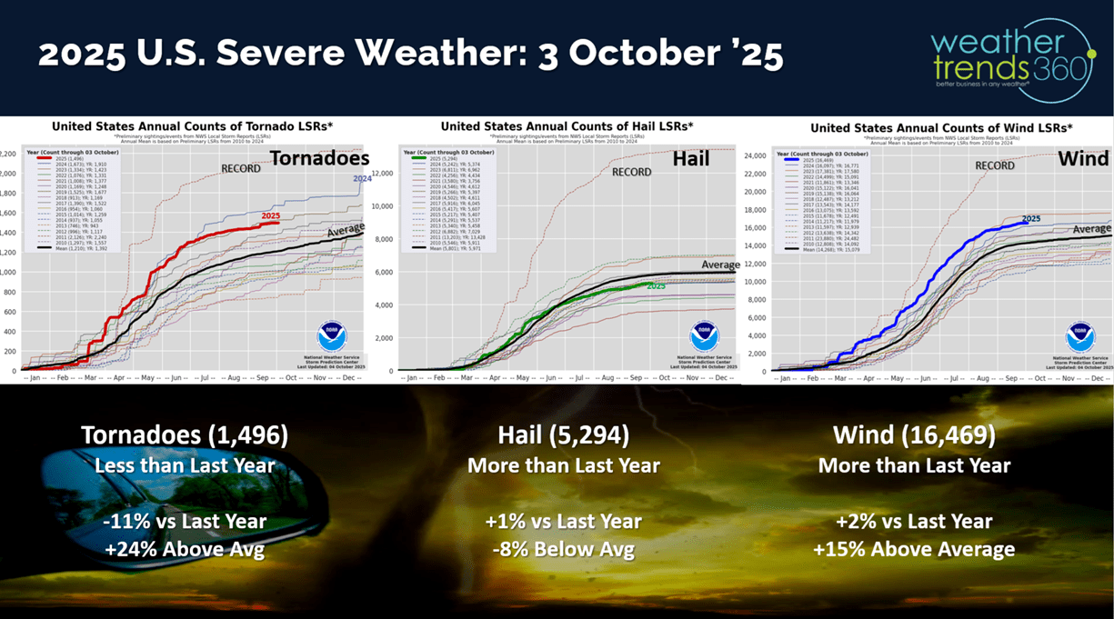 Tornadoes year-to-date down -11% vs last year, hail +1% vs last year and wind cases +2% vs last year.