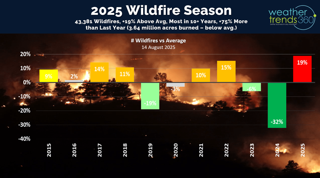 Wildfires are popping up with 43,381 so far this year which is the most in 10+ years, +19 above average and +75% vs last year. This will be a high-risk threat well into Fall.