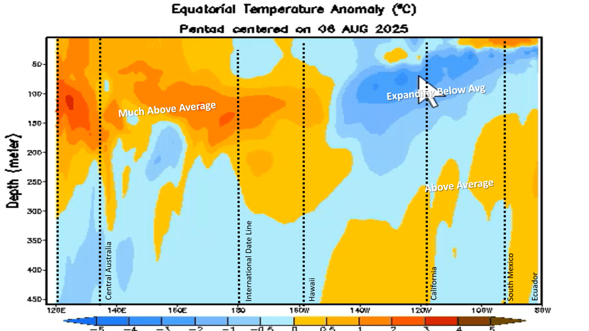 The subsurface shows some below average water temperatures across the Equatorial Pacific, but this is likely to warm as it nears the surface of the Eastern Pacific Ocean.