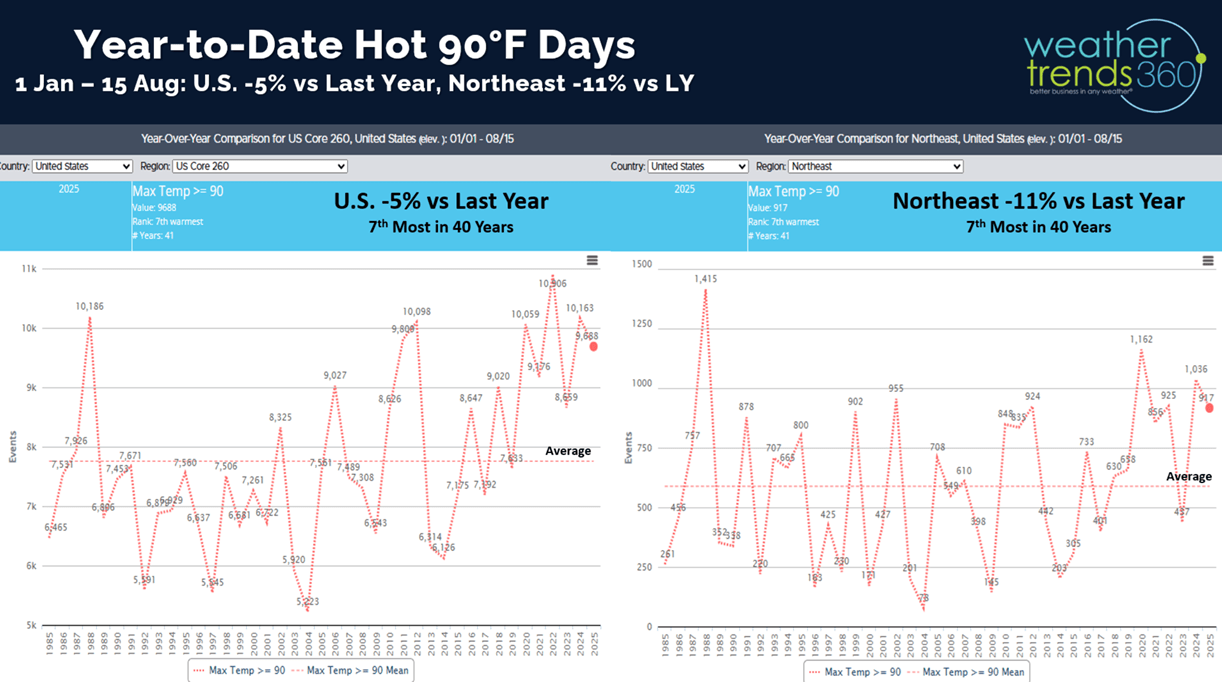 Hot 90F days across the U.S. year-to-date show -5% vs last year, but 7th most of the past 40 years. The Northeast trending down -11% vs last year and also 7th most in 40 years. This is a slightly negative factor for hot Summer seasonal categories.