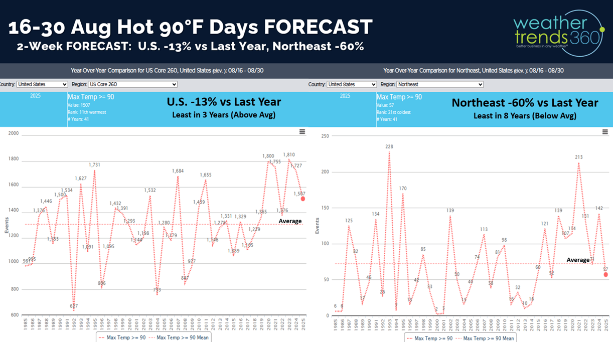 The 2-week forecast for hot 90F days show a bigger downward trend with the U.S. -13% vs last year, least in 3 years and even cooler in the Northeast trending down -60% vs last year and least in 8 years.