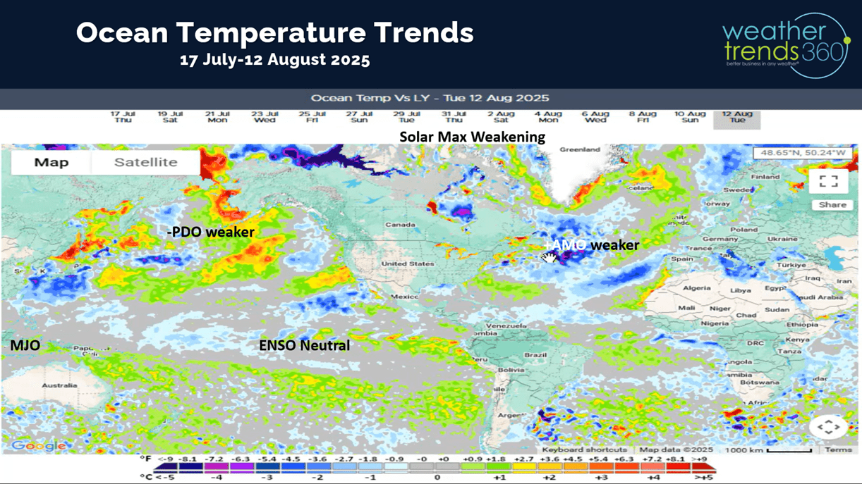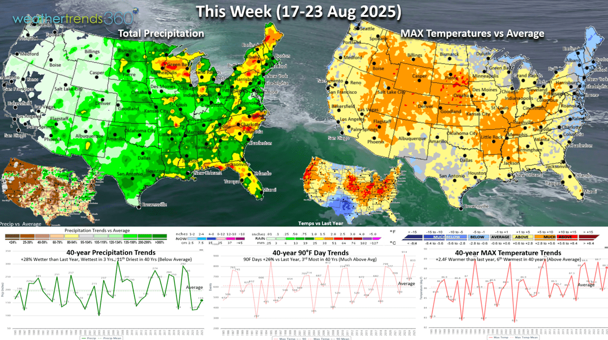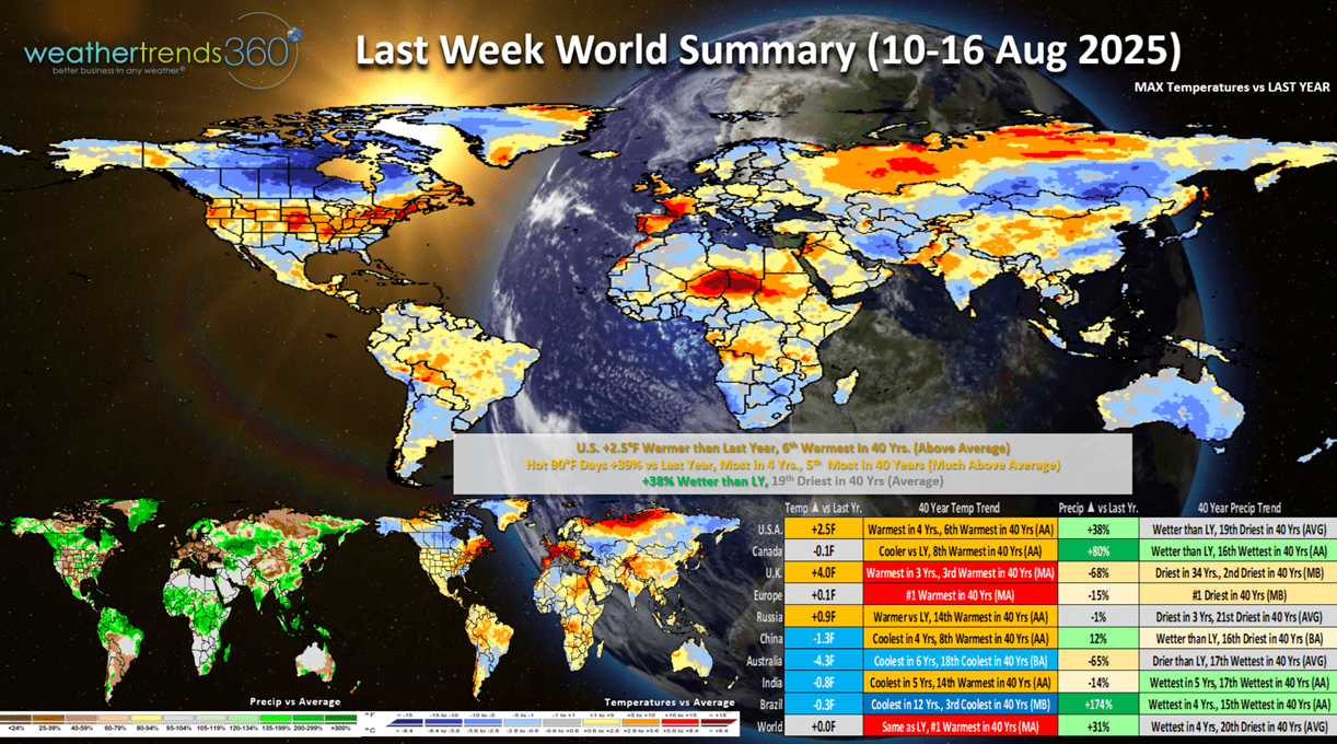 Last week (10-16 Aug) across the World shows warmer trends across the U.S. and Europe and cooler across Asia and Australia. The U.S. overall trended +2.5F warmer than last year, 6th warmest in 40 years. Hot 90F days were up +39% and most in 4 years, while rainfall was up +38% and near average nationally.