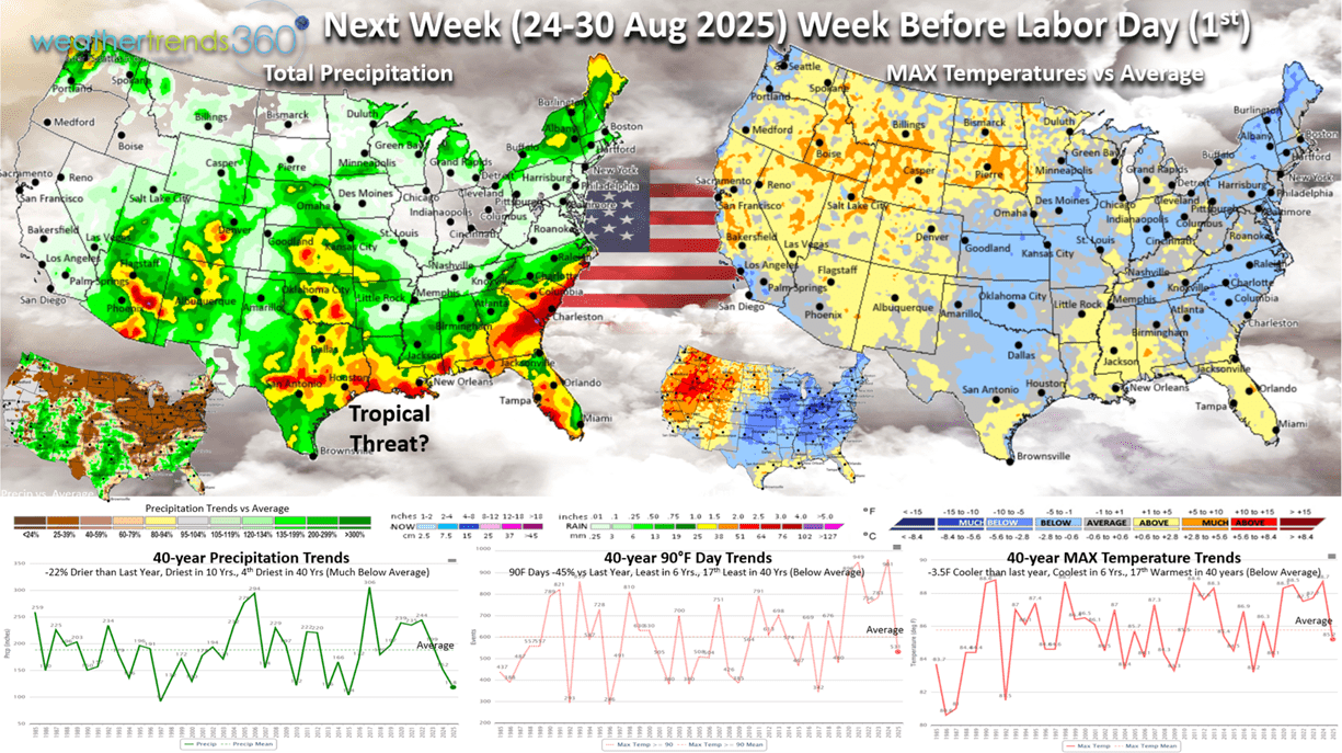 Next week (24-30 Aug) prior Labor Day weekend shows a more significant cool down with the U.S. trending -3.5F cooler than last year, coolest in 6 years and 17th coolest in 40 years. Hot 90F days down -45% vs last year, least in 6 years and 17th least in 40 years, while rainfall is down -22%, driest in 10 years. This will bring a slight bounce in back2school sales with the cooler trends. Some models hint at the risk for a tropical system in the Gulf of Mexico - TBD.