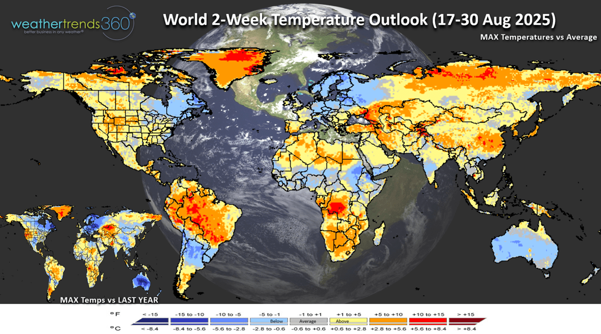 The World 2-week Temperature outlook (17-30 Aug) shows cooling trends for Eastern Canada and the Northeast U.S. and Eastern Europe.