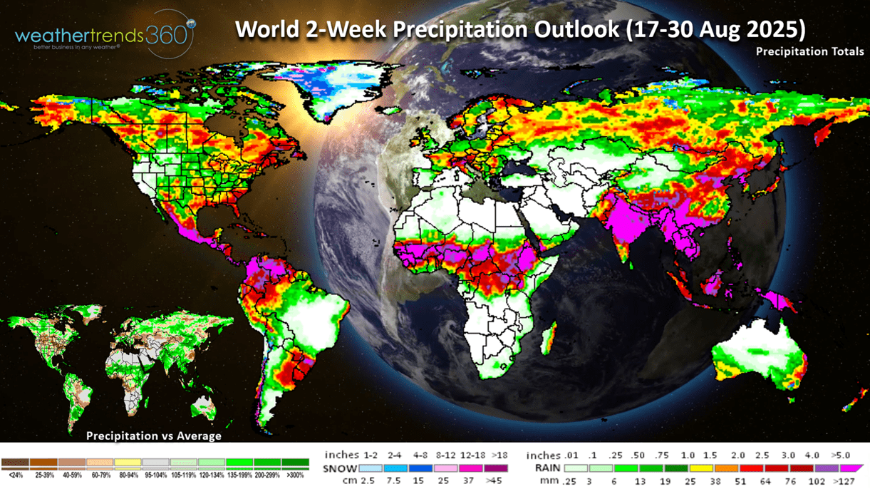 The World 2-week Precipitation outlook (17-30 Aug) shows a drier U.S. and U.K. pattern, wet in Central Europe and Central America-Mexico.