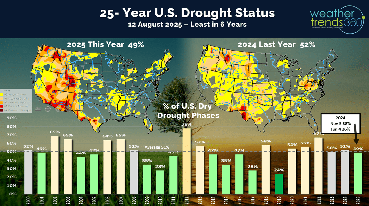 U.S. drought has dropped to the lowest levels in 6 years with 49% of the U.S. in dry to drought phases. This is way down from the near record peak of 88% back on 5 November 2024. Drought is expanding in the Western third of the U.S. Average this time of year is 51%.