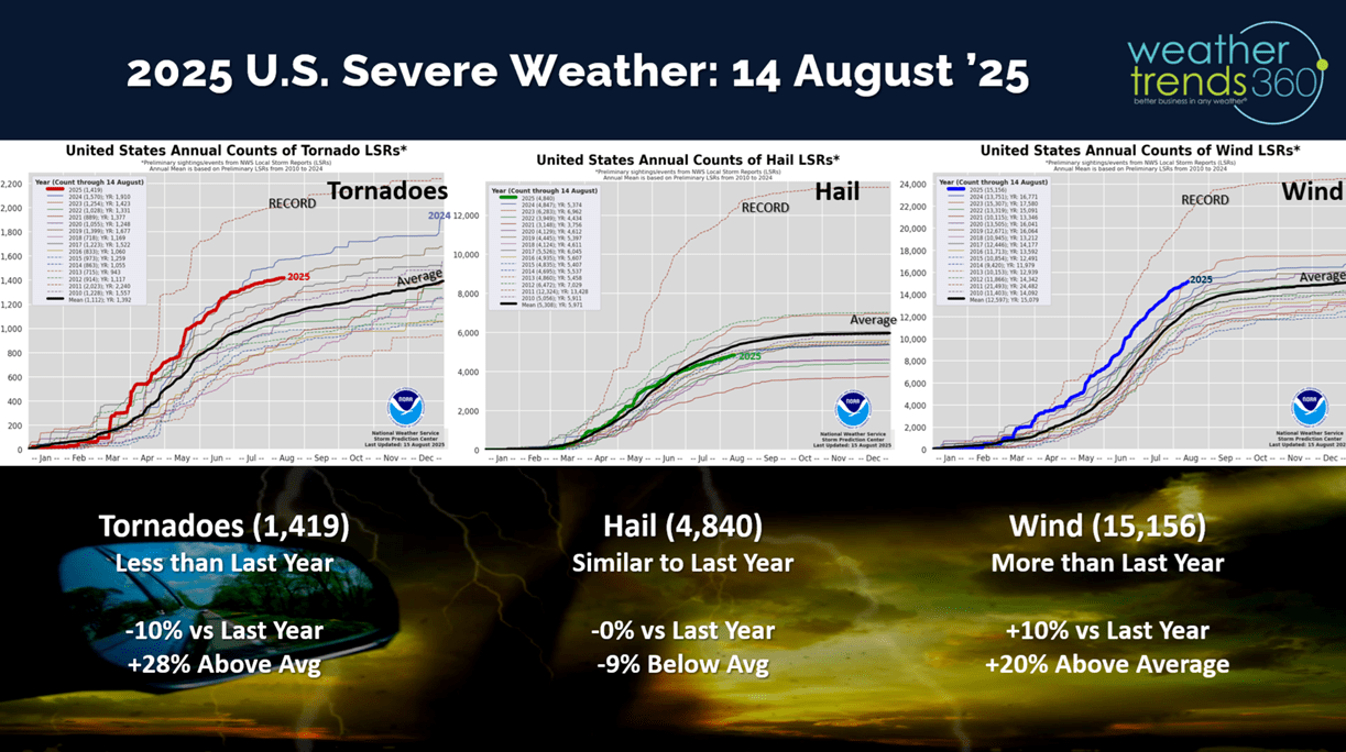 Severe Weather has slowed with tornadoes trending -10% vs last year, hail cases flat to last year and wind cases still trending +10% over last year.