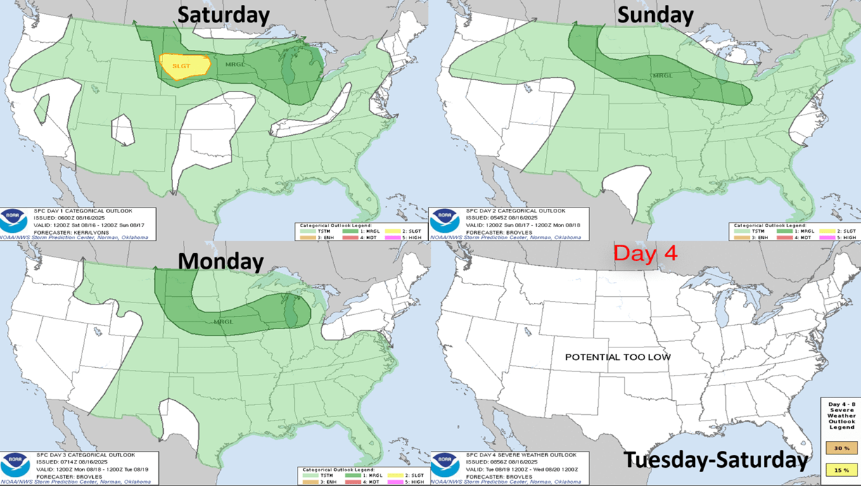 The 4-day severe weather outlook shows some minimal threats in the Upper Plains-Midwest.