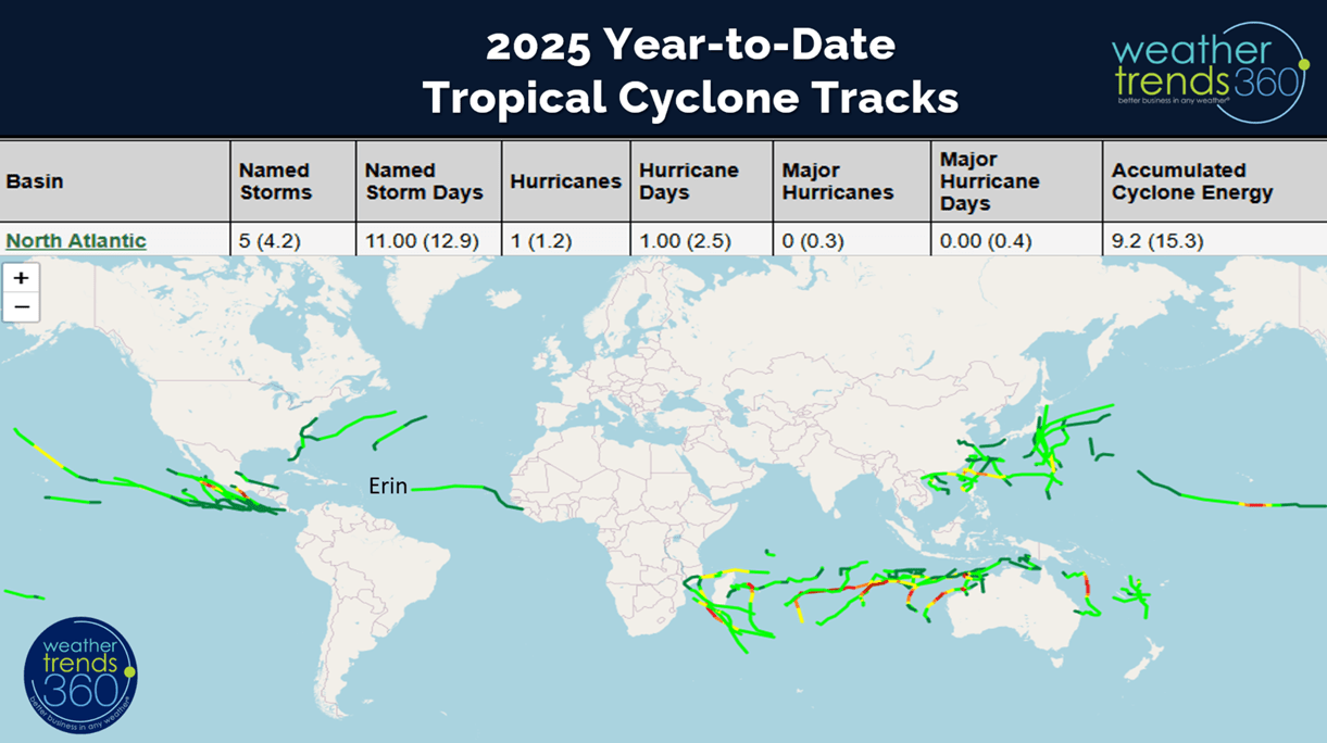Tropical activity across the World shows an active Southern Indian Ocean basin and now the Atlantic basin is heating up with major CAT 3 hurricane Erin.
