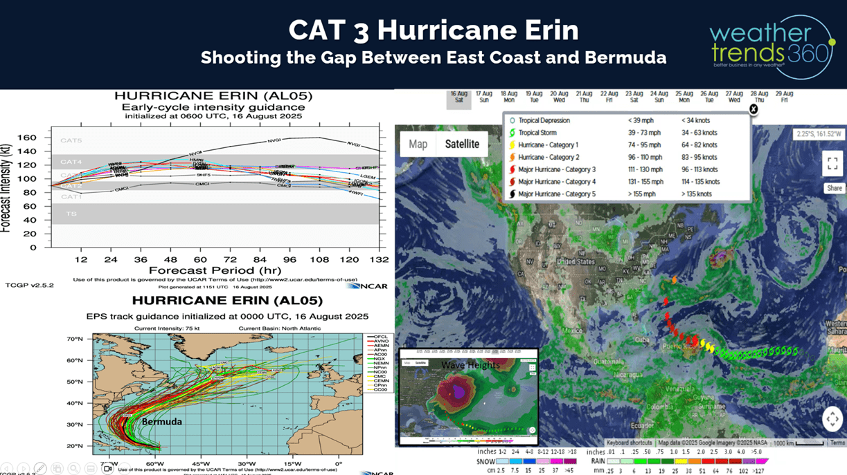 Fortunately, now CAT 4 ERIN is likely to stay about 300 miles off the U.S. East Coast and 300 miles West of Bermuda. Only impact likely to be 8-12 foot waves on Middle Atlantic and Northeast beaches the middle of next week.
