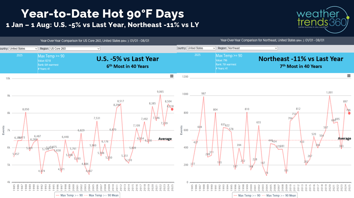 Hot 90F days year-to-date are down -5% vs last year nationally and down -11% in the Northeast. Still 6th and 7th most of the past 40 years.