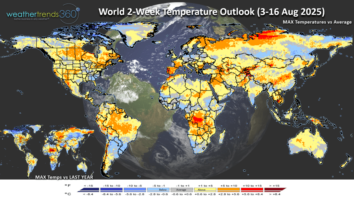 The World 2-week Temperature outlook (3-16 Aug) shows the Southeast the relatively cooler and wetter spot with building heat in the Rockies, Northeast and across Canada.