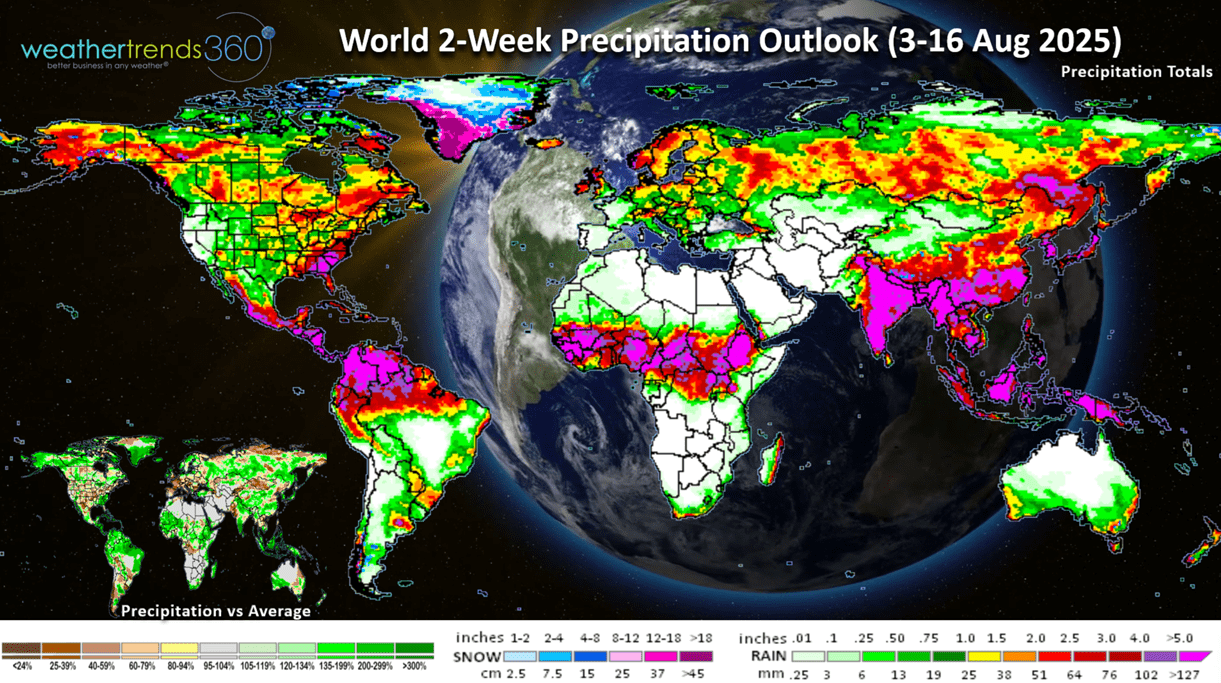 The World 2-week Precipitation outlook (3-16 Aug) shows above average rainfall across the Southeast US, but generally dry for much of the U.S. and Europe.
