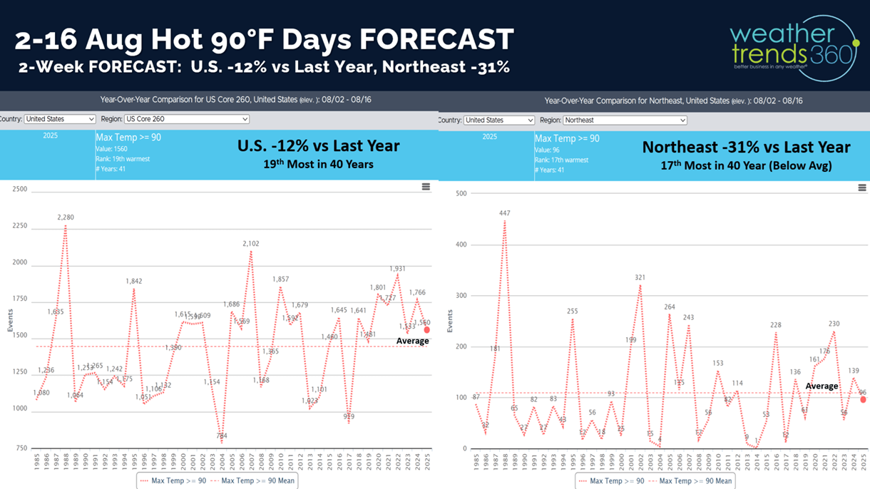 The 2-week outlook for hot 90F days shows the U.S. trending down -12% vs last year and the Northeast down -31% vs last year. Still warm but a drag on Summer clearance sales for hot seasonal categories.
