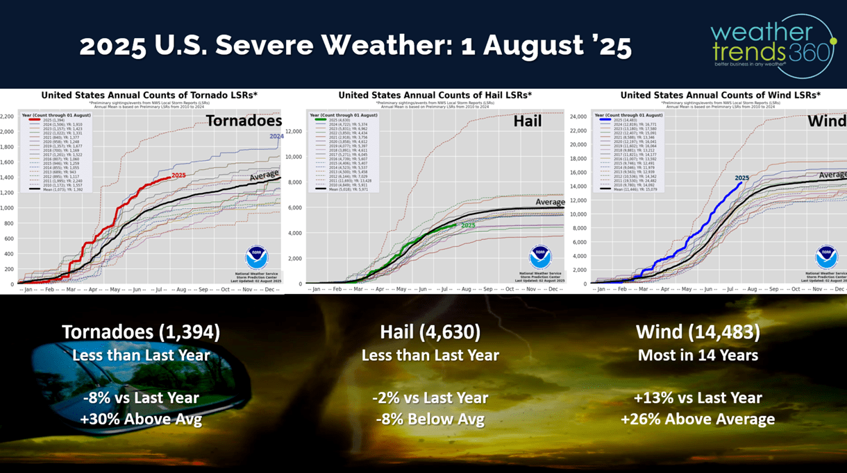 Severe Weather continues to show tornadoes down -8% vs last year, hail -2% vs a year ago while wind cases have been the most in 14 years.
