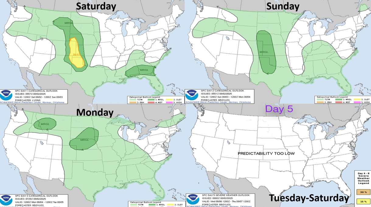 The 3-day severe weather outlook shows some risk in the Central Plains but nothing widespread.