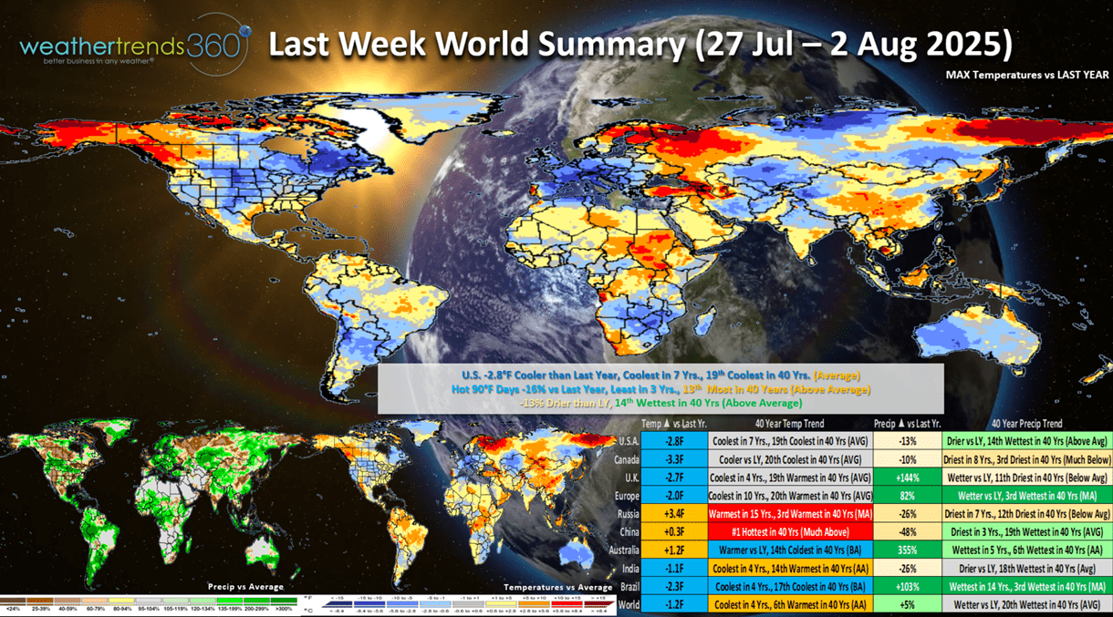 Last week (27 Jul - 2 Aug) across the World shows the U.S. trending -2.8F cooler than last year, coolest in 7 years and 19th coolest of the past 40 years. Hot 90F days were down -16% vs last year, least in 3 years but 13th most in 40 years. Rainfall was down -13% vs LY but still 14th wettest of the past 40 years. This time of year, cooler and wetter weather is better for back2school seasonal sales. The hot spots were across Russia and China, while Europe was the coolest in 10 years and 3rd wettest in 40 years.