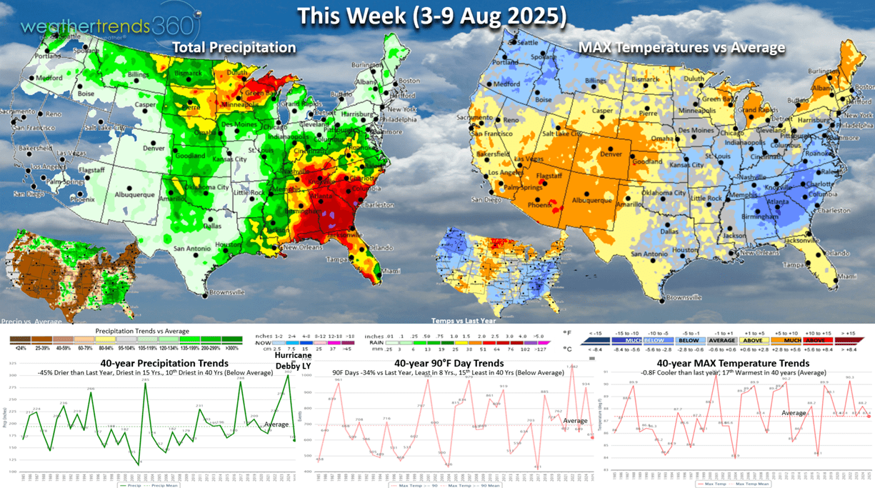 This week (3-9 Aug) show the U.S. again trending -0.8F cooler than last year and 17th warmest of the past 40 years. Quite cool by August standards in the Southeast with heavy rain. Hot 90F days nationally are down -34% vs last year, least in 8 years and 15th least in 40 years (Below Avg). Rainfall down -45% vs last year when Hurricane Debby drenched the Middle Atlantic, driest in 15 years and 10th driest in 40 years. Cool and Wet in the Southeast does help back2school sales with kids already going back to school.