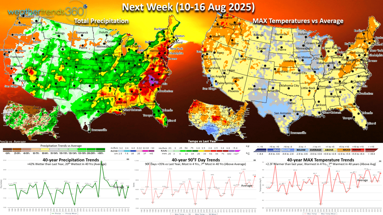 Next week (10-16 Aug) starts a warming trend with the U.S. trending +2.3F warmer than last year, warmest in 4 years and 7th warmest of the past 40 years. Hot 90F days also up +35% vs last year, most in 4 years and 7th most in 40 years, while rainfall is up +42% and 20th wettest of the past 40 years. A dramatic warming trend in the Northeast.