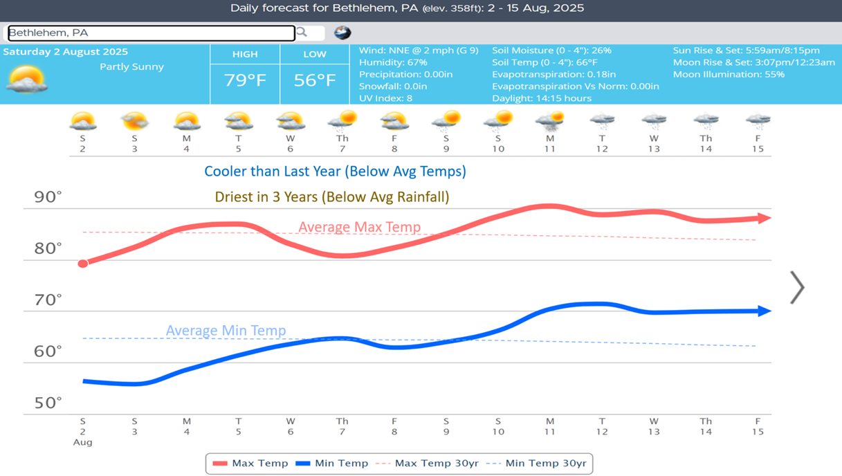 10-day Musikfest here in Bethlehem PA. Over 1.25 million folks will invade town for the event. And the weather looks fantastic with below average temperatures and the driest conditions in 3 years.