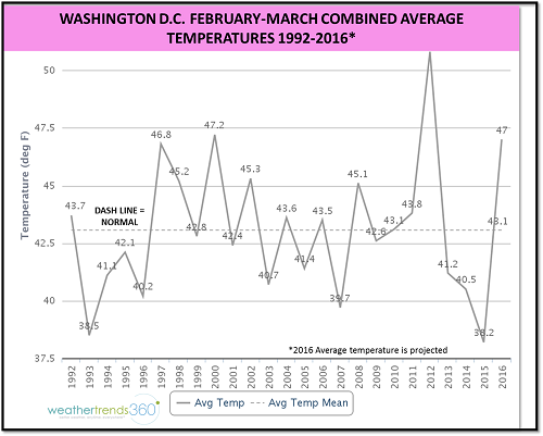 As with any plant, the blossoming of the cherry trees in Washington D.C. is highly dependent on the weather. Given that we've had a record warm winter, it should come as no surprise that the cherry tree bloom is expected to be earlier than normal this year. The average peak blossom occurs sometime around April 1st to April 4th. This year, the National Park Service, who up until 2 days ago had a rather conservative (a.k.a. near normal) forecast of peak blossoming occurring around March 31st to April 3rd, has recently updated their forecast for peak blossom between March 18th and the 23rd. The last time the cherry trees blossomed this early was 4 years ago in 2012, which happened to coincide with the warmest February and March combined period of the past 25 years for the city of Washington D.C. (see chart below for average February-March temperatures for the past 25 years). This year, wt360 projects that D.C. will end up seeing the 3rd or maybe even the 2nd warmest February to March period in the past 25 years.