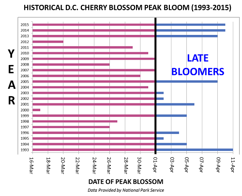 Very cold winters the past 3 years in D.C. have resulted in a later than normal blossom for the cherry trees. This year, spring has come early and so too will the cherry blossoms. The annual Cherry Blossom Festival runs unusually long, from March 20th to April 17th, so there should be plenty of beautiful flowers around for at least the beginning of the festival. However, if the peak blossom occurs any earlier than the 18th, there may only be a couple of days of being able to view the trees in full bloom during the festival.
