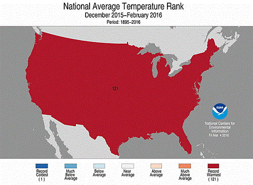 The National Oceanic and Atmospheric Association just released their Winter 2015/2016 (December 2015-February 2016) temperature rankings which makes this the warmest winter on record for the continental U.S. (see temperature ranking map below). A record strong and well-advertised El Nino contributed to the warmth in the winter which had people and plants alike confused. In December, I witnessed cherry trees blossoming in southeastern Pennsylvania making it a 'Pink Christmas' instead of a 'White Christmas'. Those trees are about to blossom again as we enjoy record warmth in the East. The famous cherry trees in Washington D.C. are on the verge of developing green buds, and peak blossom will follow likely within the next 2 weeks.