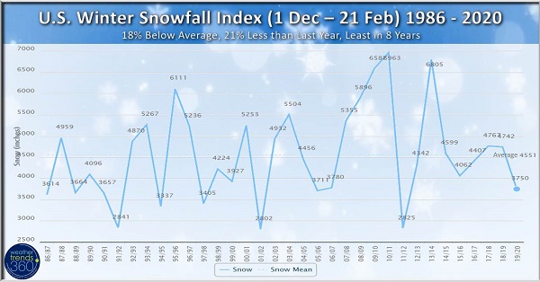 1. Snowfall was the least in 8 years and 10th least in 35 years trending 18% below average and 21% less than last year.