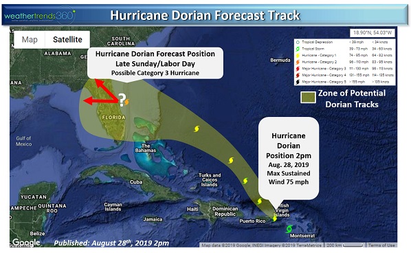 Dorian is menacing the U.S. and British Virgin Islands and Puerto Rico today with strong winds and heavy rain. Current forecasts bring the storm through or just to the north of the Bahamas over the upcoming weekend and on a track towards the U.S. mainland. There is still plenty of uncertainty surrounding the final track of Dorian. Interests from the northeastern Gulf Coast to the Florida Peninsula and even up to Cape Hatteras should be on-guard for possible impacts from Dorian over the Labor Day holiday weekend.