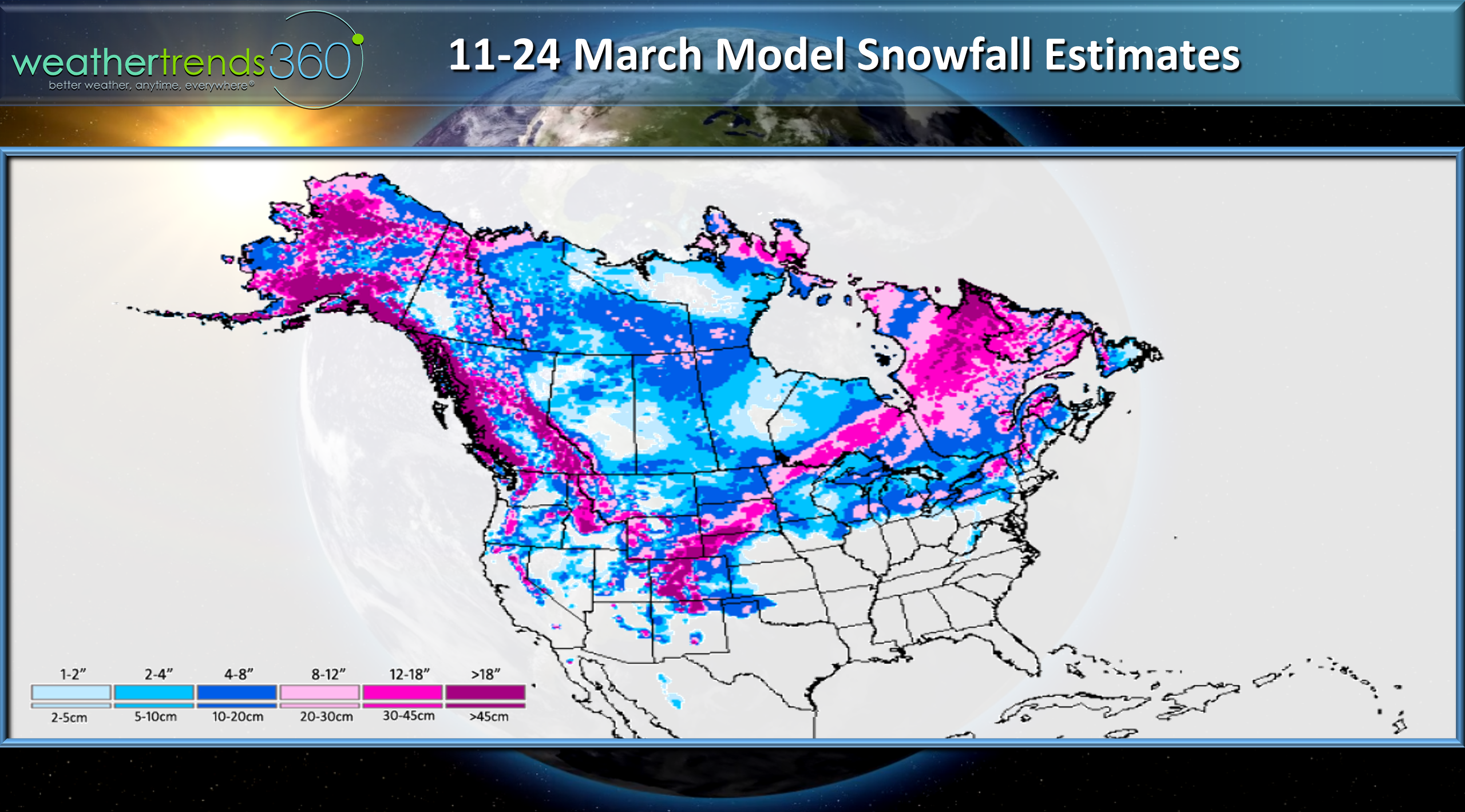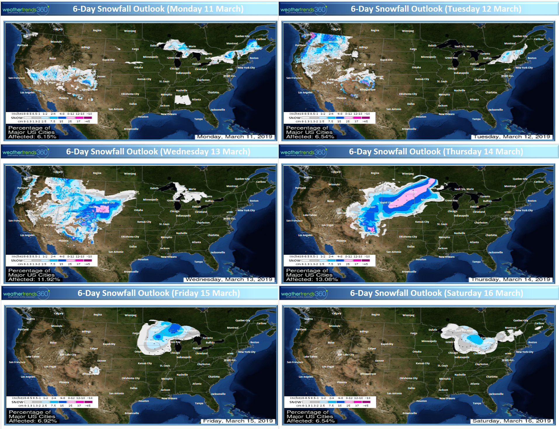 The 6-day snowfall outlook (11-17 March) shows yet another moderate to heavy snow storm traversing out of the Rockies into the Upper Midwest.