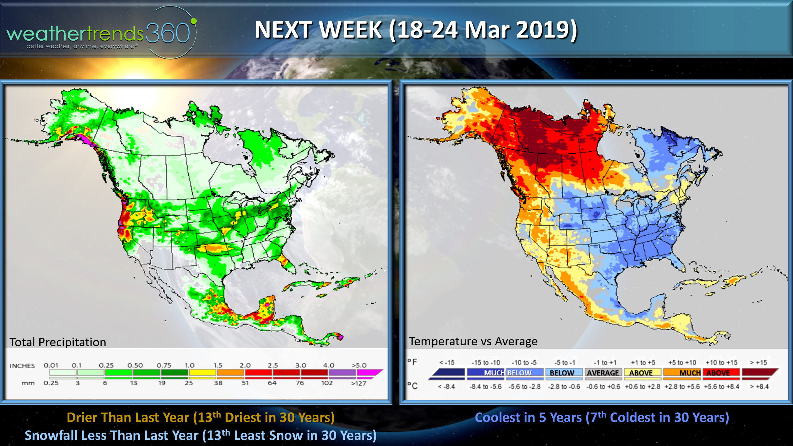 Next week (18-24 March) shows signs of change with a big warm up for the West which should start to traverse East late month into April. The period trends the coolest in 5 years nationally (7th coldest in 30 years, Drier than last year (13th driest in 30 years) and less snow than last year (13th least snowfall in 30 years).