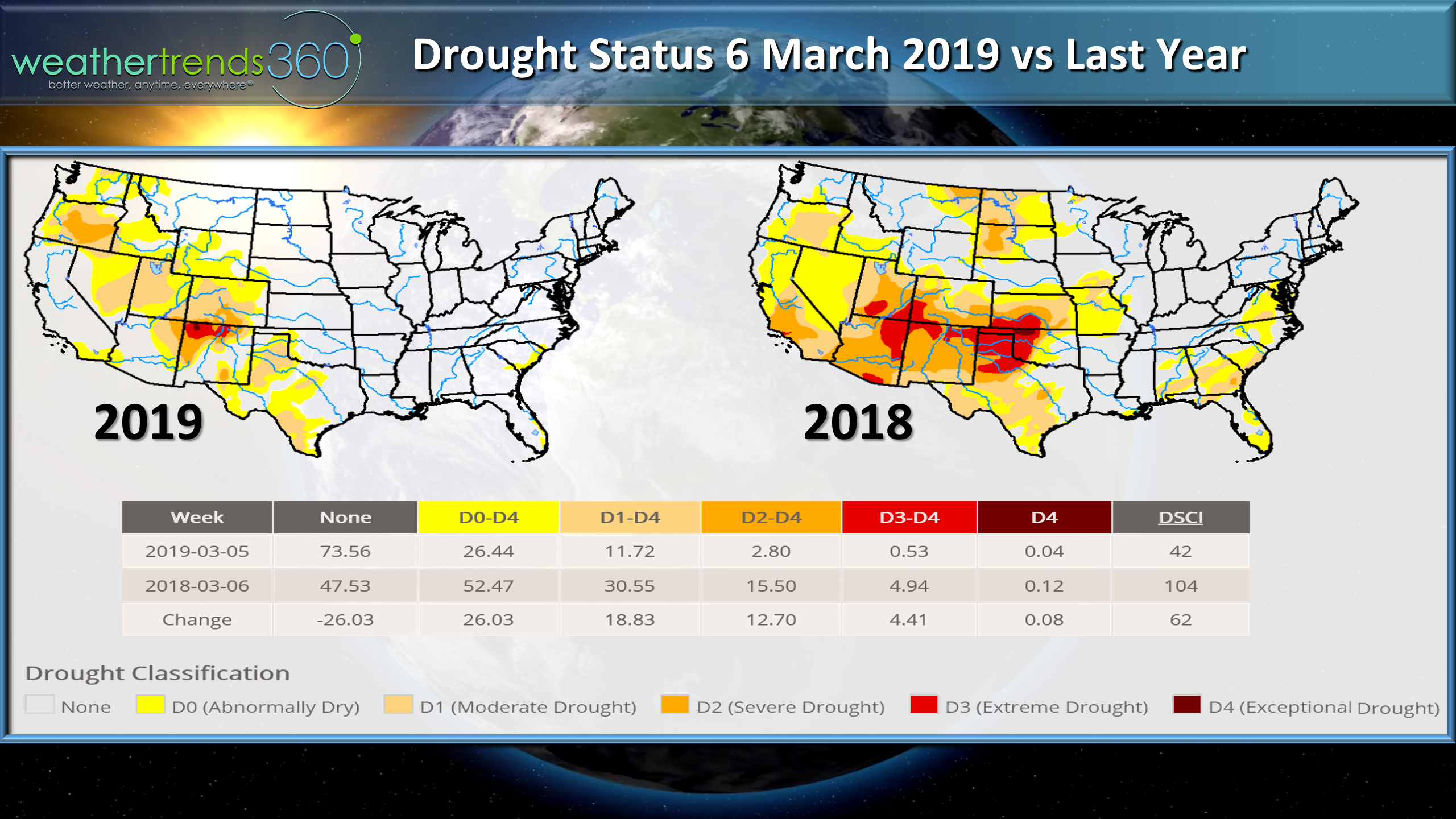 Drought is much less than last year and limited to the Rocky Mountains into the Pacific Northwest. This is one of many factors that suggest that a hotter Summer will be limited to the Rockies with a downstream trough in the Midwest and East with cooler weather.