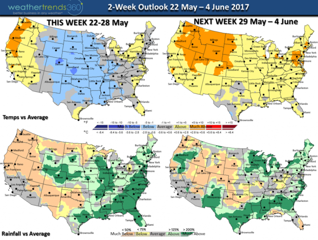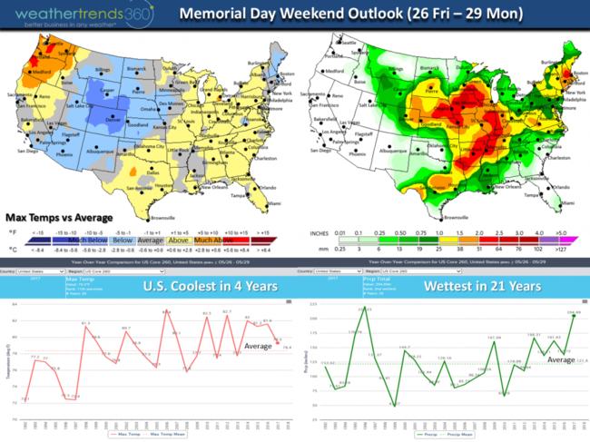 (22-28 May) with much cooler temperatures and a fair amount of storminess. For the U.S. overall this week before Memorial Day trends the coolest in 4 years and slightly below average nationally and the wettest in over 26 years. CLICK ON IMAGES FOR LARGER VIEW.