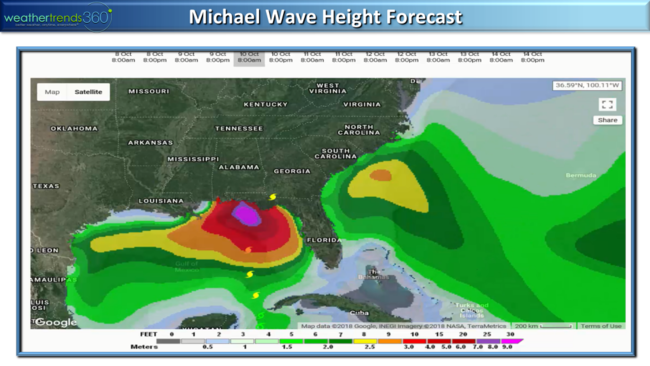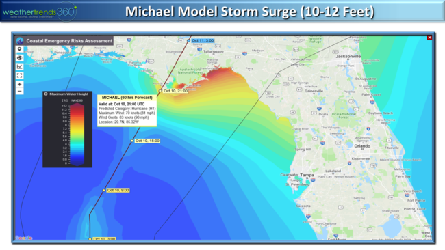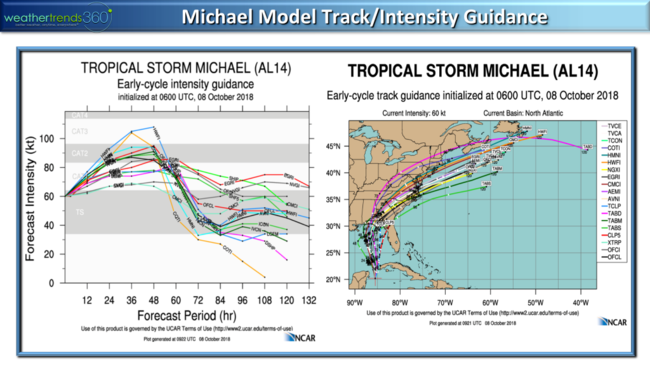 The model guidance suggests a stronger hurricane is likely on the high end of Cat 1 all the way up to a Cat 3 with landfall Wednesday afternoon near Apalachicola Bay. From there it races off the East Coast so the flooding will not be on par with Florence but it will bring heavier 3-6"+ rainfall totals from FL to VA. This is the 13th named storm for the 2018 season, and 14th system...an above average year as expected.