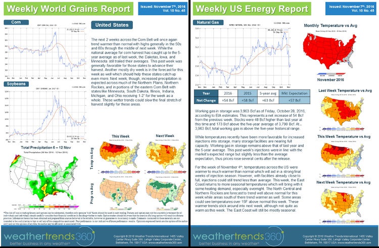 View SampleThis grouping of reports focuses on short and longer range weather effects on Grains and US Natural Gas. These reports are published once a week on Monday morning around 11:30am and will be available for download under the Energy/Ag section of the Reports tab.
